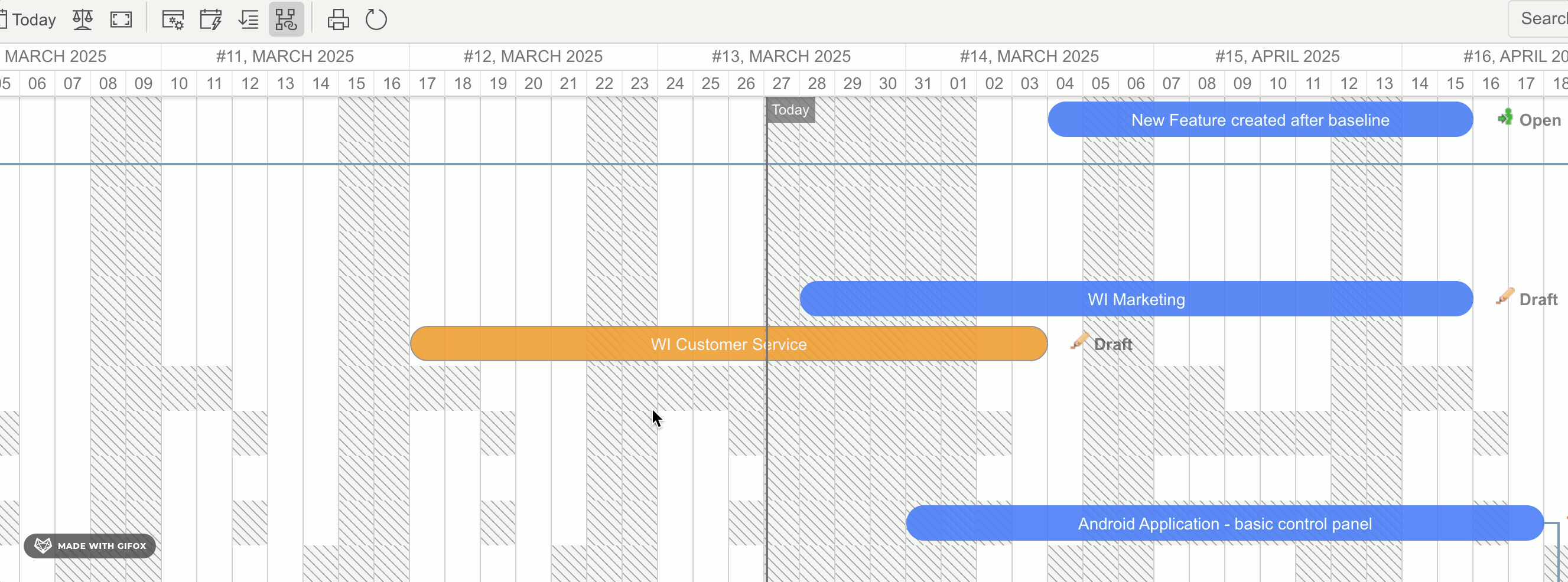 Since version 25.3.0 we polished the feature that marks tasks with a NEW badge when comparing the current state with any historical version — whether by date, Revision, or Baseline. The badge appears next to tasks that were created after the selected comparison point, helping you quickly spot newly added work items.