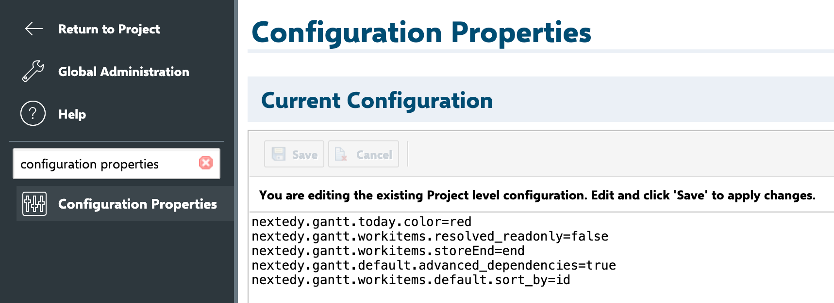 nextedy.gantt.workitems.default.sort_by- Default value for "Sort By" property. Default is: idnextedy.gantt.workitems.default.expand_level- Default value for "Load children" property, it specifies how many levels should be added to the dataset. Default is: 0nextedy.gantt.workitems.default.show_unplanned- Default value for "Show Unplanned" property. Default is: truenextedy.gantt.workitems.default.scale- Default value for "Scale" property. Default is: Wnextedy.gantt.workitems.default.parent_link_roles- Default value for "Parent Link Roles" property. It is a list of link role IDs separated by ";". Default is: emptynextedy.gantt.workitems.default.dependency_link_roles- Default value for "Dependency Link Roles" property. It is a list of link role IDs separated by ";". Default is: emptynextedy.gantt.workitems.default.start_field"- Default value for "Start Field" property. Default is: gantt_startnextedy.gantt.workitems.default.end_field- Default value for "End Field" property. Default is: nonenextedy.gantt.workitems.default.duration_field- Default value for "Duration Field" property. Default is: gantt_durationnextedy.gantt.workitems.default.progress_field- Default value for "Progress Field" property. Default is: gantt_progressnextedy.gantt.workitems.default.maximize_view- Default value for "Maximize" property. Default is: falsenextedy.gantt.workitems.default.hide_toolbar- Default value for "Hide Toolbar" property. Default is: falsenextedy.gantt.workitems.default.progress_coloring- Default value for "Progress Coloring" property. Default is: truenextedy.gantt.workitems.default.drag_children- Default value for "Drag Children" property. Default is: truenextedy.gantt.workitems.default.max_items- Default value for "Max Items" property. Default is: 100nextedy.gantt.workitems.default.show_today_marker- Default value for "Show Today Marker" property. Default is: truenextedy.gantt.workitems.default.working_time- Default value for "Show Today Marker" property. Default is: true- nextedy.gantt.workitems.resolved_readonly - Default value to allow moving resolved items on the Gantt chart. Default is: true