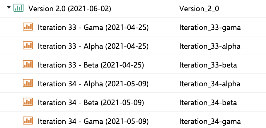 Each of those plans (Iteration 5 - Alpha, Iteration 5 - Beta, and Iteration 5 - Gamma) is treated as a completely separate entity.