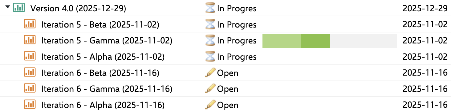 In this demo project, we are looking at Version 4.0, which contains several team-specific iteration plans - such as Iteration 5 - Alpha, Iteration 5 - Beta, and Iteration 5 - Gamma, followed by Iteration 6 - Alpha, Iteration 6 - Beta, and Iteration 6 - Gamma.