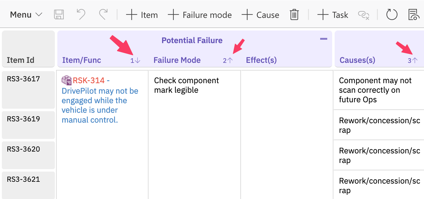 In the following example, the system first sorts by "item", then by "failure mode", and finally by "causes".