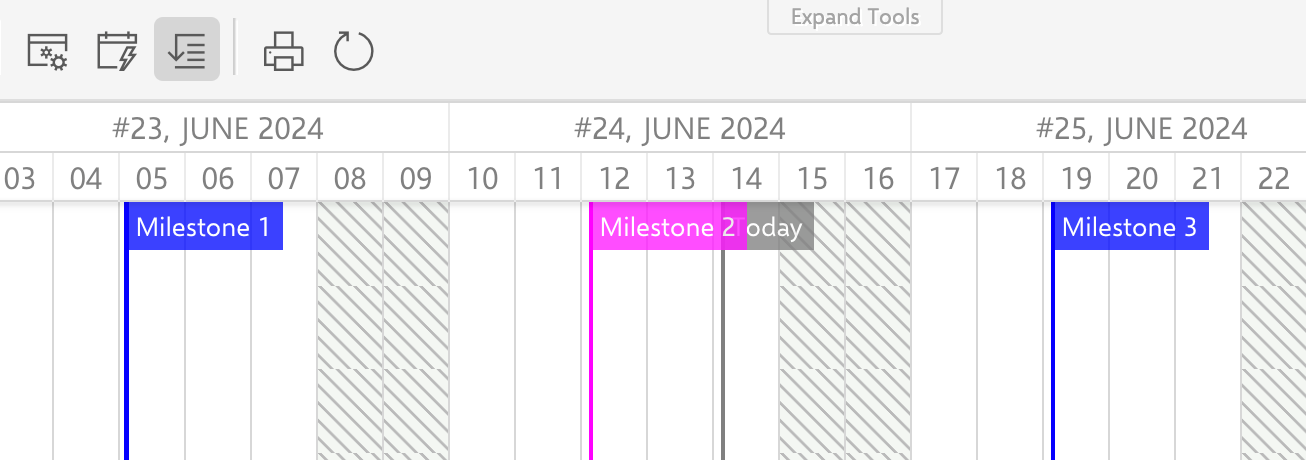 As a result, Gantt displays only selected items as Milestone Markers. The date is taken from the 'releaseDate' field. Markers for Milestones 1 and 3 appear blue (since 'productType' has a value), while Milestone 2 is pink because its 'productType' is typeB: