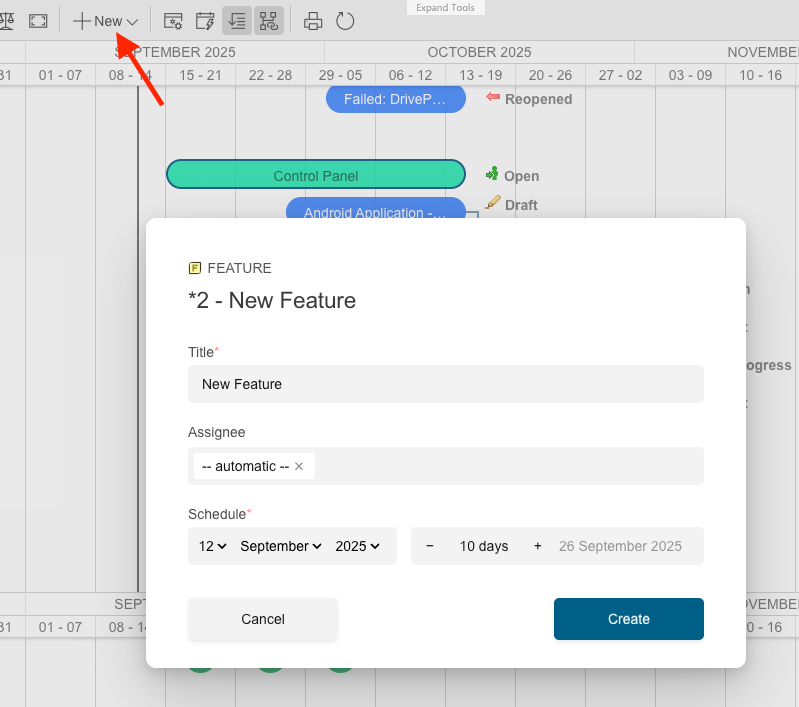 To add a new Work Item, use the +New button while in Edit mode. Make sure the creation dialog is properly configured.